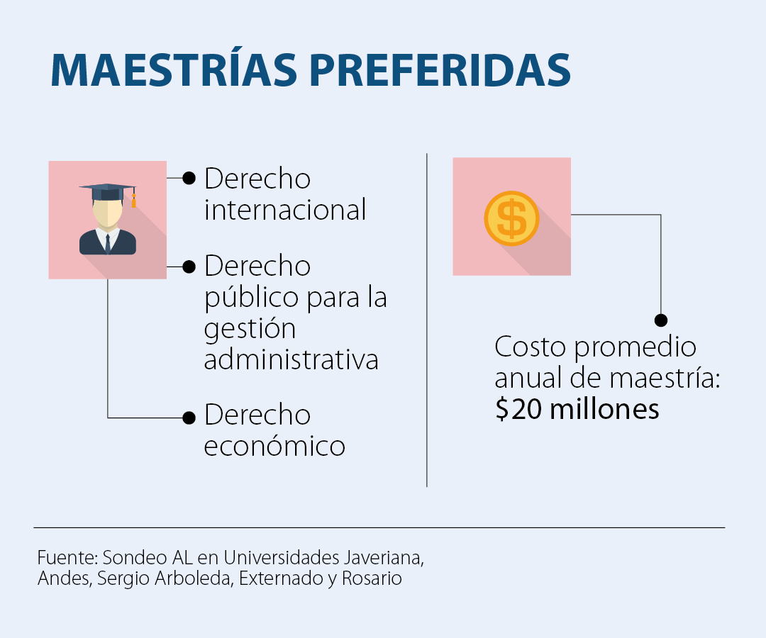En Colombia, según confirmó AL con Uruena; con Julio Andrés Sampedro, decano de Ciencias Jurídicas de la Universidad Javeriana, con Jorge Iván Rincón, director de posgrados en Derecho de la Universidad Externado de Colombia y con Jeniffer Garzón, directora de posgrados en jurisprudencia de la Universidad El Rosario, las maestrías que tienen más demanda en la actualidad son las que tienen que ver con derecho administrativo, económico, internacional y en menos medida con derecho laboral.