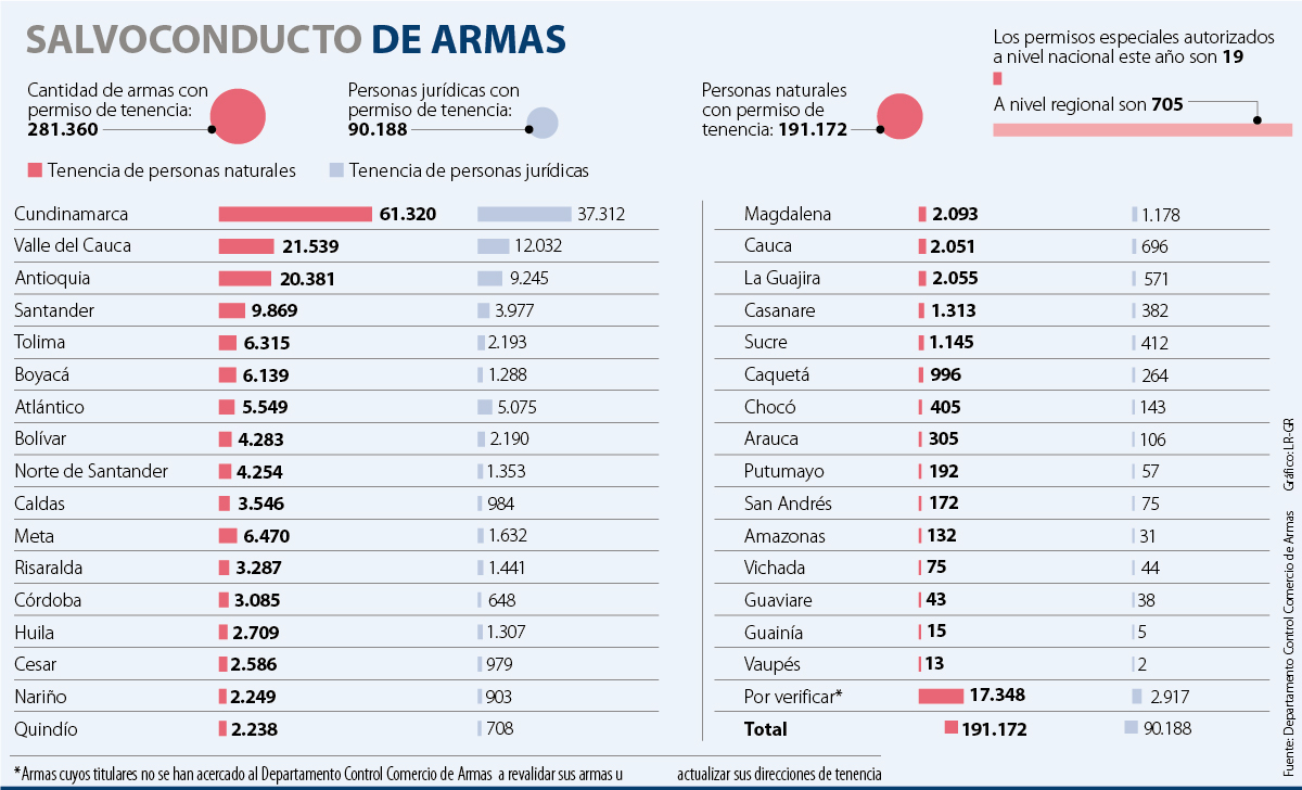 Según el Departamento de Control de Comercio de Armas, hay 281.360 permisos aprobados para el porte legal de armas en el territorio nacional. De este total, las personas naturales con autorización ascienden a 191.172, mientras que 90.188 son personas jurídicas.