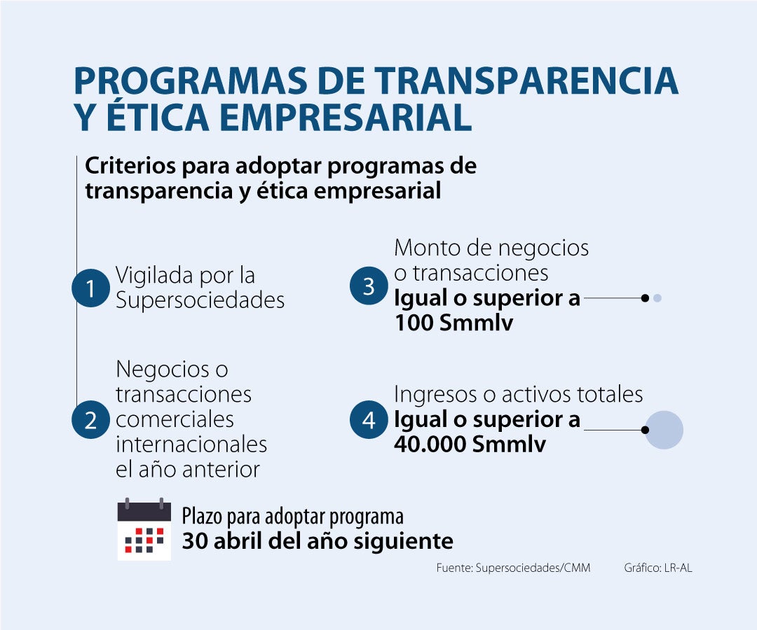 Bajo la nueva normativa, los criterios esenciales para determinar si una sociedad debe implementar un programa de transparencia y ética empresarial son fundamentalmente cuatro: que se trate de una sociedad vigilada por la entidad; que el año anterior haya hecho negocios o transacciones comerciales; que esos negocios o transacciones hayan sido iguales o superiores a 100 salarios mínimos mensuales legales vigentes (smmlv); y que la sociedad haya tenido ingresos o activos totales iguales o superiores a 40.000 smmlv. (el cálculo sería con el salario mínimo de 2021)