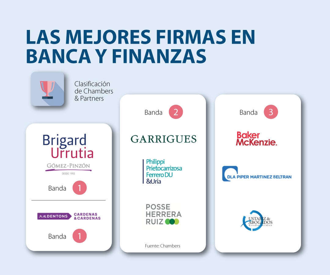 En la práctica de Banca y Finanzas, el ranking destacó la labor de nueve firmas y 21 abogados, en las distintas categorías que maneja. Tres firmas recibieron la calificación de Banda uno: Brigard Urrutia; Dentons Cardenas & Cardenas; y Gómez- Pinzón.