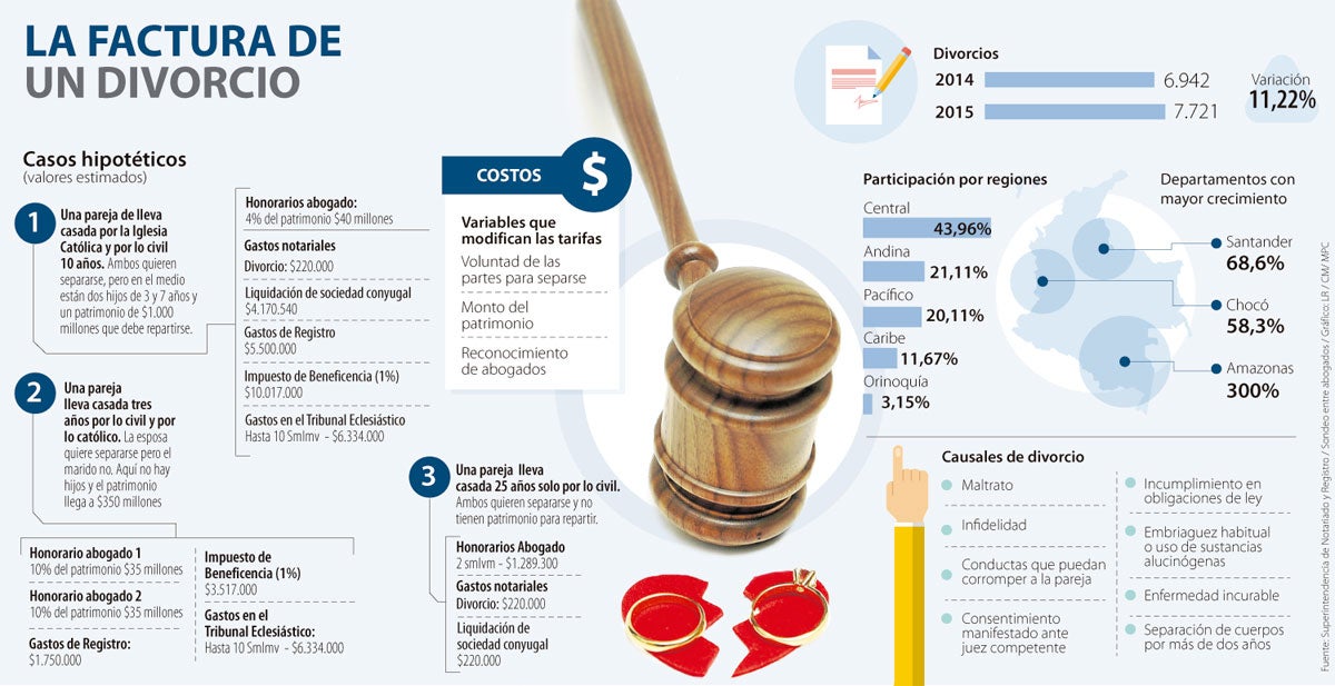 Mientras en los primeros cinco meses del año se estaban casado 24.206 parejas, 7.721 se estaban divorciando, de acuerdo a la Superintendencia de Notariado y Registro. De las regiones de Colombia, la Central y Andina son las que presentan mayor participación en divorcios durante el período comprendido entre enero y mayo de 2015. La Zona Central muestra un 43,96% equivalente a 3.394 divorcios y la Andina 21,11% correspondiente a 1.630 divorcios. En cuanto a incrementos de divorcios, Medellín aumentó sus superaciones 44,19%, Bogotá, 12,13% y Cali, 2,54% .
