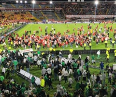Los hechos ocurrieron este martes cuando al término del primer tiempo del partido entre Independiente Santa Fe y Nacional, se desató el enfrentamiento entre las mal llamadas ‘barras bravas’ de ambos equipos al interior del escenario deportivo, donde resultaron heridas varias personas.