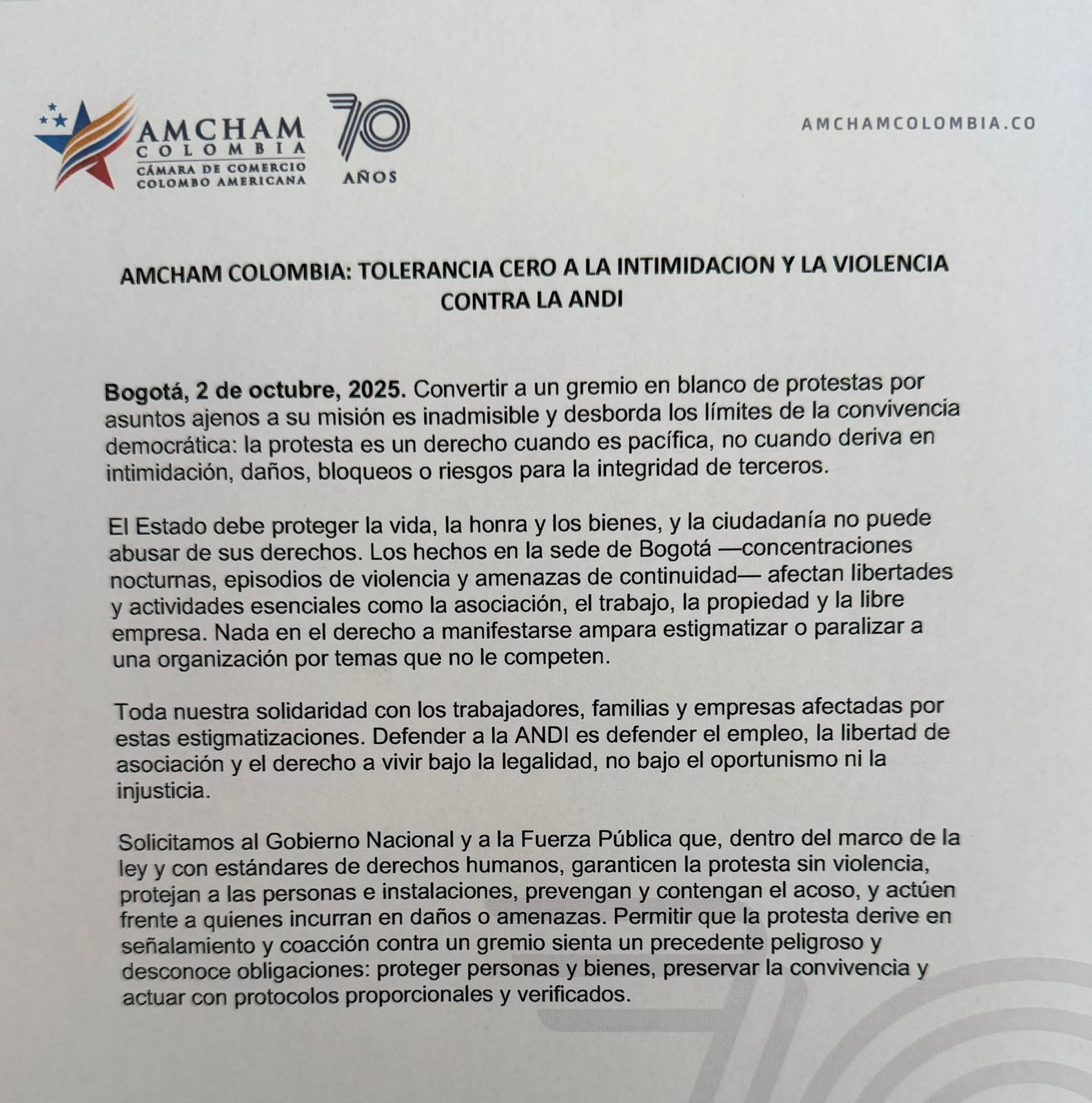La Cámara de Comercio Colombo Americana, AmCham, mostró su rechazo respecto a las manifestaciones que se llevaron a cabo en las instalaciones de la Asociación Nacional de Empresarios de Colombia, Andi, a favor de Palestina.
