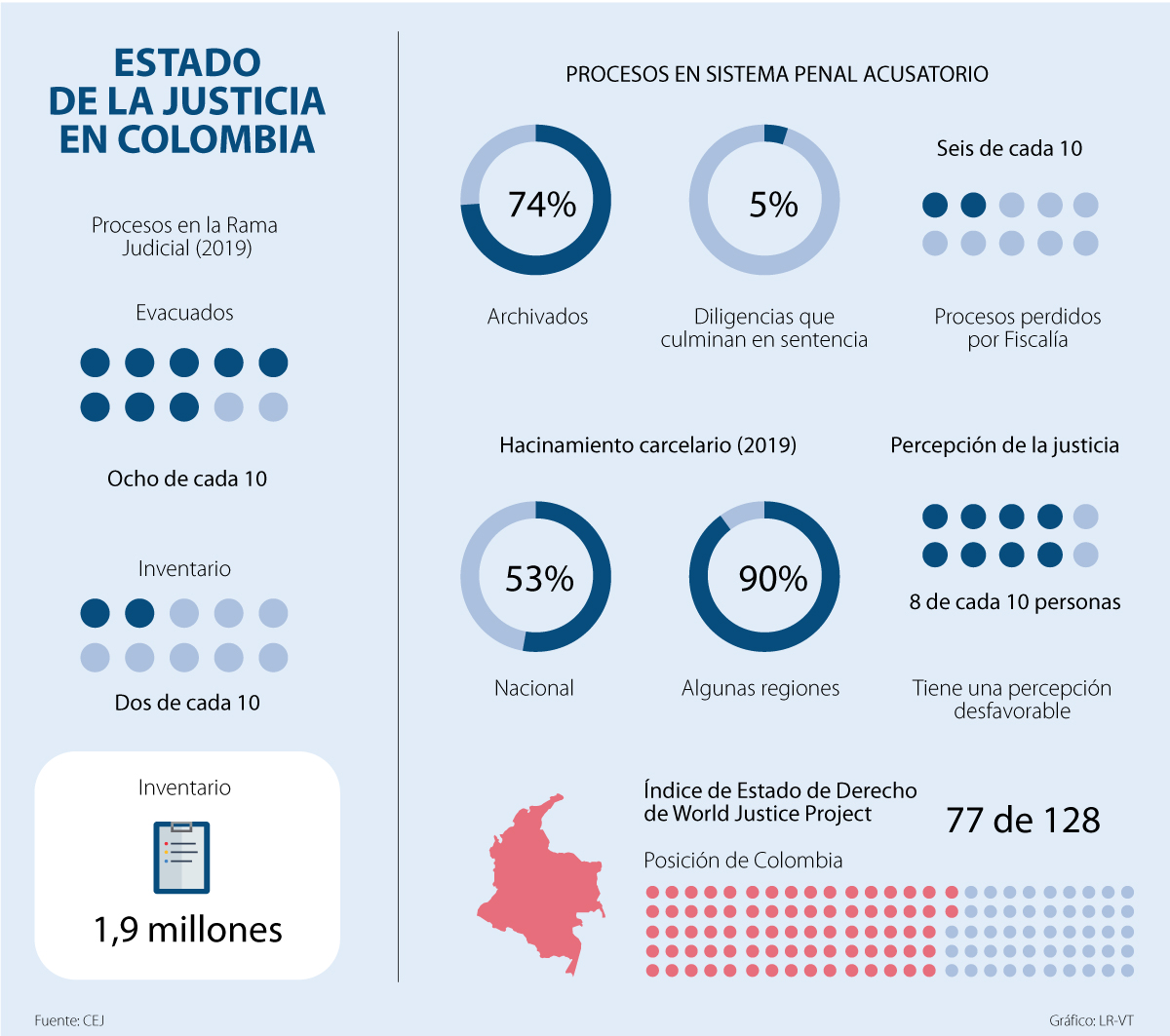 Lo anterior, sin embargo, no es un tema netamente de percepción. Así lo confirma el informe sobre el estado de la justicia en Colombia elaborado por el centro de pensamiento Corporación Excelencia en la Justicia (CEJ), que tras analizar varios indicadores encontró, entre otras cifras, que solo 5% de las diligencias en la justicia penal culminan en una sentencia judicial. Además, con relación al tiempo procesal para la resolución de un proceso en particular, este puede tardar, en promedio, entre tres y cinco años para culminar en una sentencia en juicio oral.