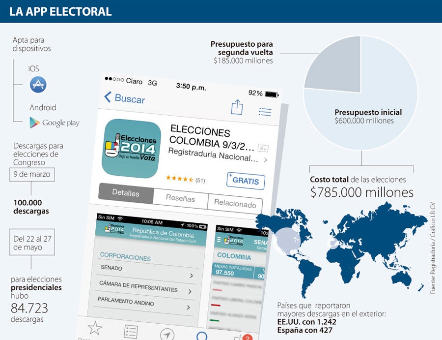 Dice el documento de la Registraduría que en AppleStore la aplicación llegó a liderar el ranking de aplicaciones gratuitas en la categoría de noticias durante su hora de ‘gloria’ el pasado fin de semana.