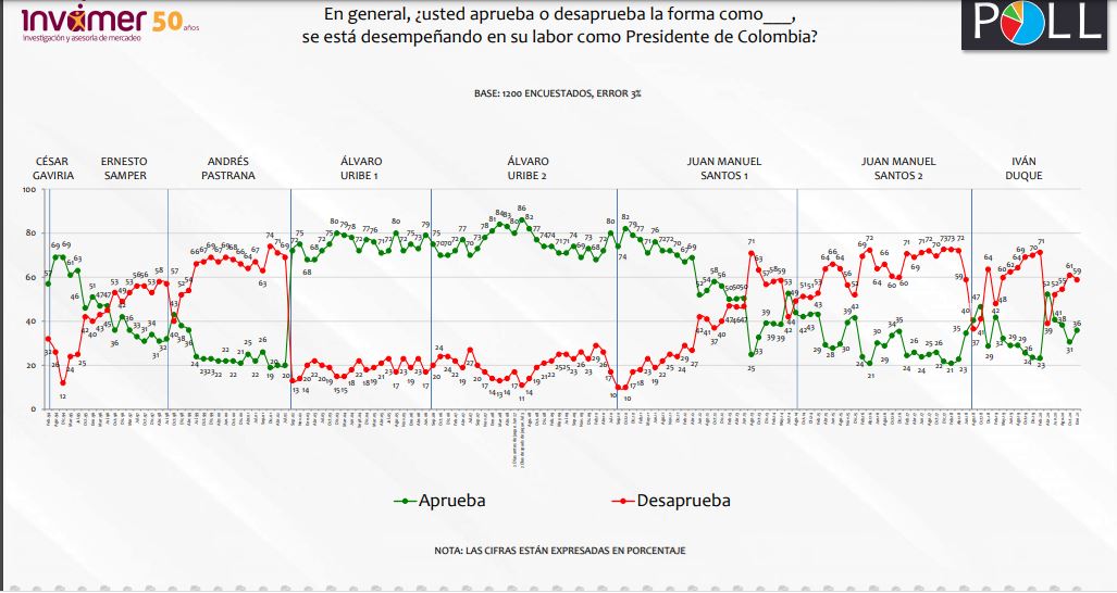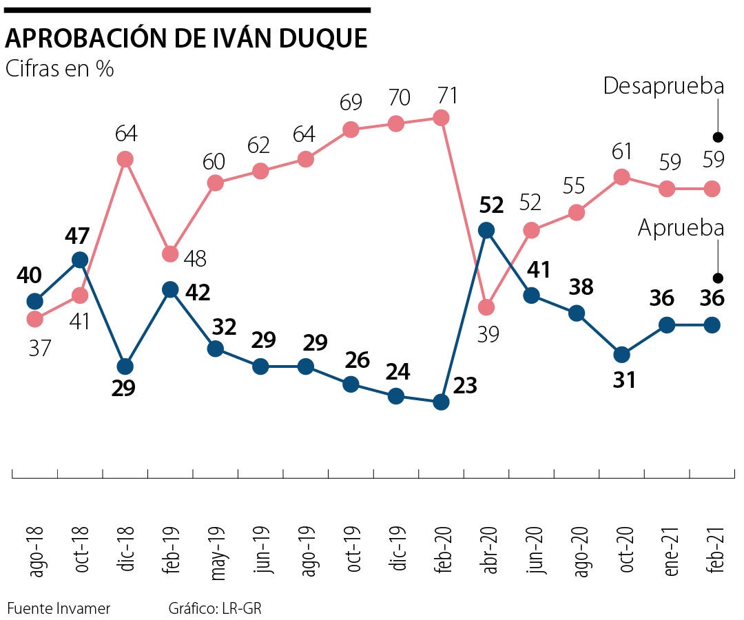El mandatario, sin embargo, ha logrado ganar terreno en la aprobación ciudadana, pues una de las cifras más altas de disconformidad se presentó en febrero de 2020 cuando Invamer reveló 71% de desaprobación según la percepción de las personas sondeadas.