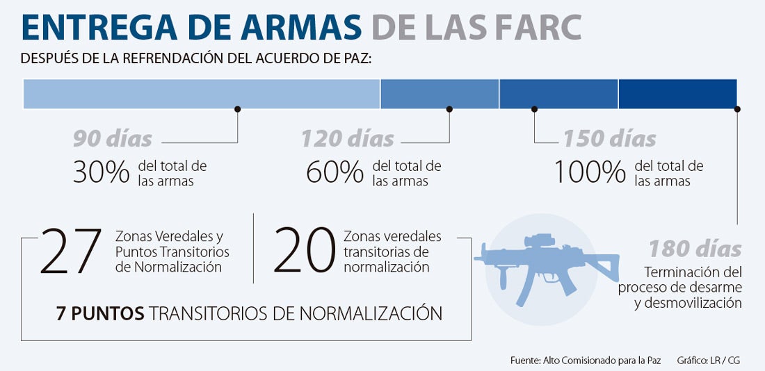Según quedó consignado en el acuerdo de paz, tras la refrendación que se hizo en el Congreso de la República, se cuentan 90 días para entregar el 30% del armamento, luego en el día D+120 otro 30% y en el día D+180 el 40% restante.