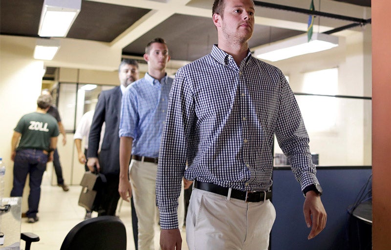 A lo anterior se suma que imágenes de televisión mostraron a los nadadores olímpicos Gunnar Bentz y Jack Conger entrando en una oficina de la policía en el aeropuerto para ofrecer su testimonio.