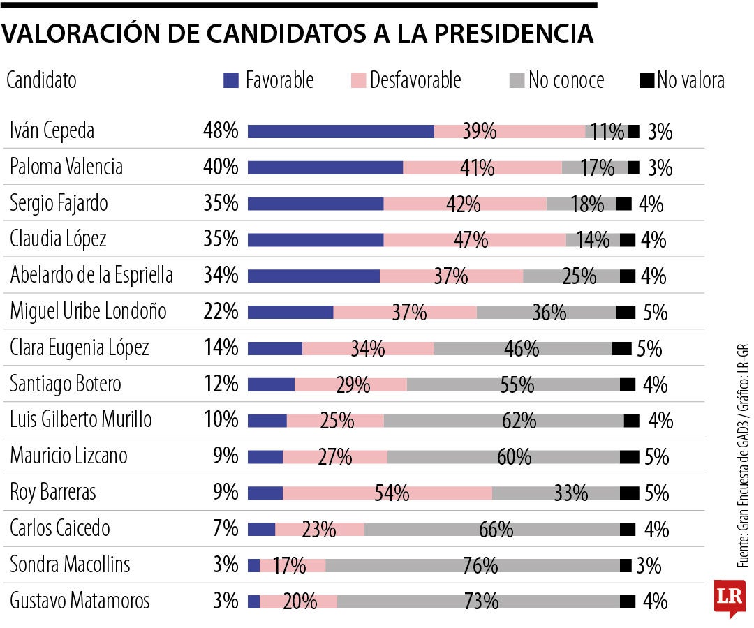 Los dos candidatos que obtuvieron mayor favorabilidad fueron Iván Cepeda y Paloma Valencia, con 48% y 40%, respectivamente