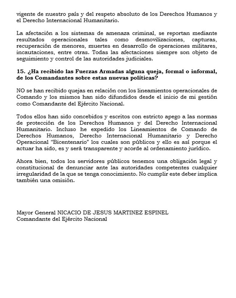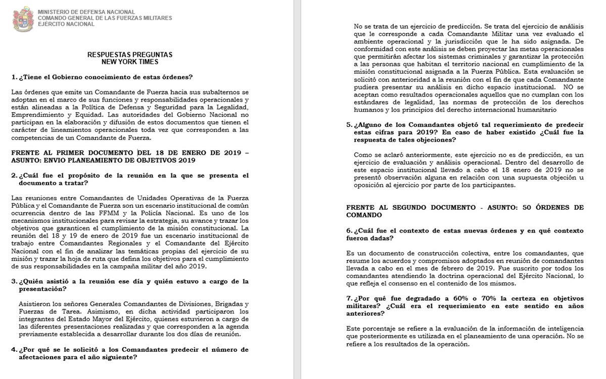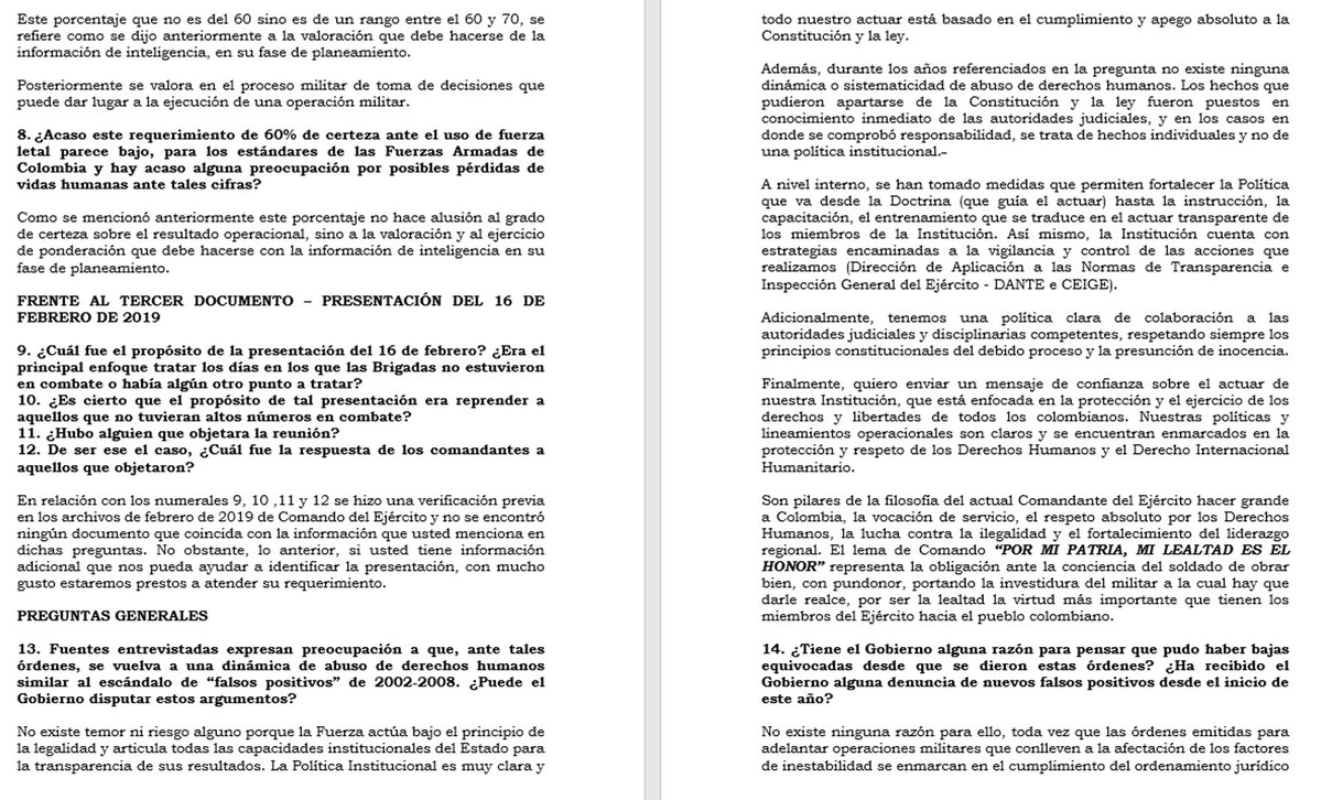 Tras la publicación, el ministro de Defensa, Guillermo Botero, ordenó al Comandante del Ejército Nacional, el Mayor General Nicacio Martínez, que hiciera públicas las repuestas que se enviaron al medio, tras lo cual el comandante publicó en su cuenta de Twitter una copia del documento, y aseguró "tener su conciencia tranquila".