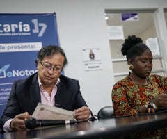 El aspirante del Pacto Histórico, Gustavo Petro, se presentó a la Notaría 17 de Bogotá, junto a su fórmula vicepresidencial, Francia Márquez, para firmar un documento en el que se comprometen a no expropiar en caso de que ganen las elecciones.