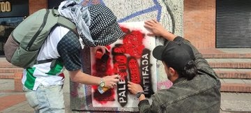 - Una parte de los manifestantes vandalizó la sede de la Jurisdicción Especial para la Paz (JEP) mientras otro sector motivaba con cánticos. "El incendio no lo sienten hasta que les queman la casa. Palestina libre", dice la pintura en la pared. Además, encapuchados se acercan a las personas alrededor que están grabando para pedirles que borren los registros.