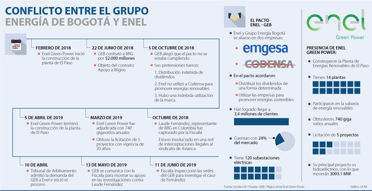 El Grupo Energía Bogotá (GEB) y la multinacional Enel tienen pendiente un pleito arbitral por la repartición de dividendos, la participación en el tema de energías renovables y el uso de las marcas. En la disputa se discuten $394.000 millones en dividendos, más un monto adicional que deberá ser tasado por los árbitros.