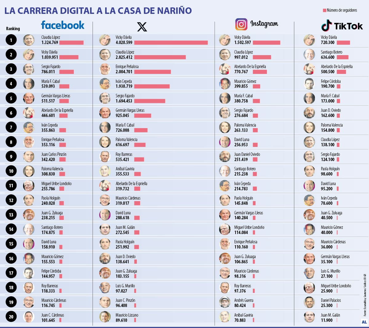 En X, la periodista Vicky Dávila lidera con 4,02 millones de seguidores, casi el doble que la segunda en la lista, la exalcaldesa Claudia López, quien cuenta con 2,8 millones. El top tres lo completa el exalcalde Enrique Peñalosa, con algo más de 2 millones.