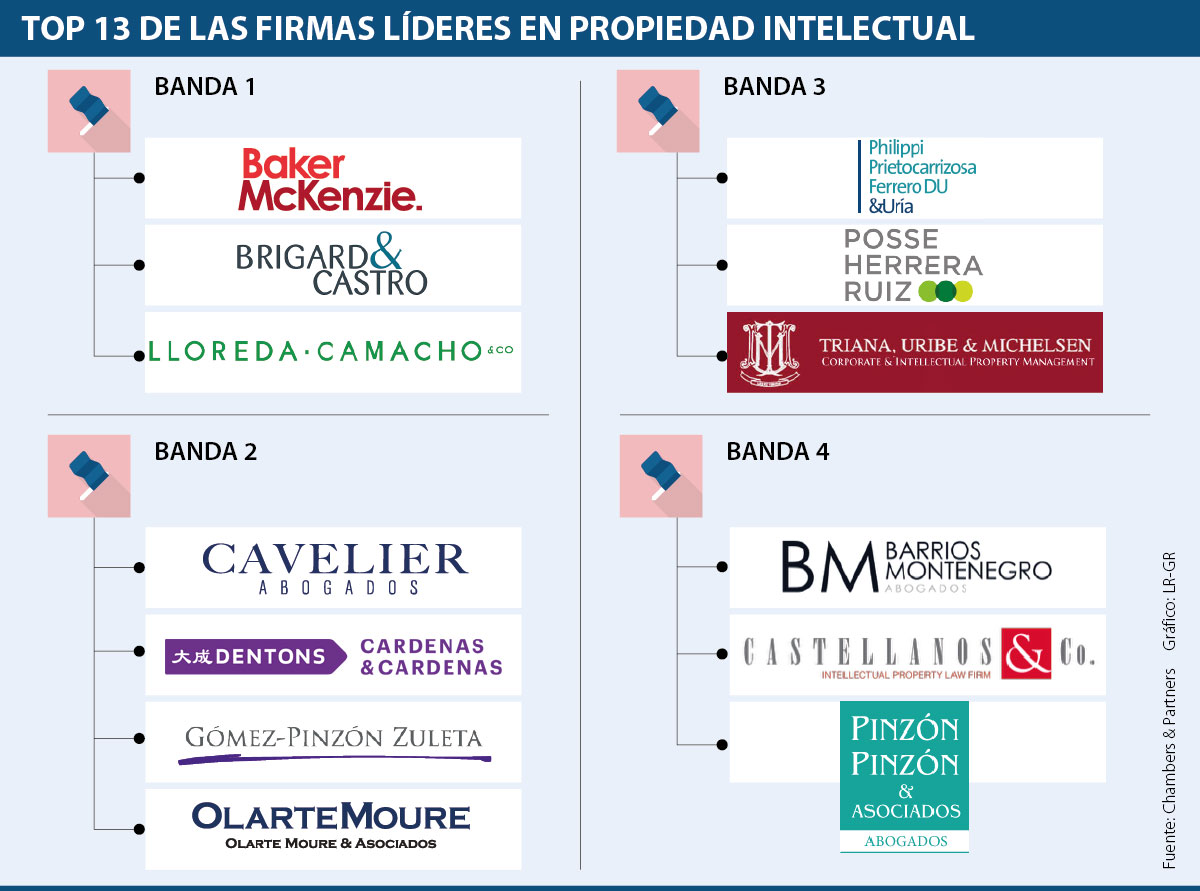 En el país, según la organización inglesa Chambers & Partners, Baker McKenzie, Brigard & Castro y Lloreda Camacho & Co son los bufetes que mandan en el área de propiedad intelectual.