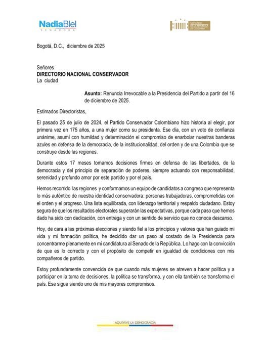 “Les presento mi renuncia irrevocable al cargo de Presidenta del Partido Conservador Colombiano, a partir del próximo 16 de diciembre de 2025”.