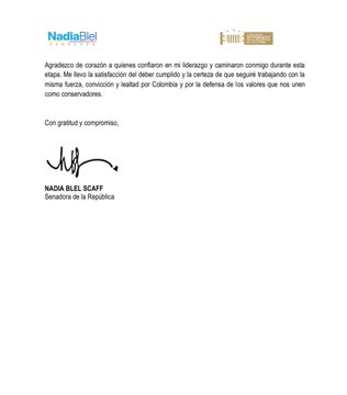 El futuro del Partido Conservador se encuentra en el limbo por tensiones internas, ya que, Nadia Blel, senadora de la República acaba de comunicar su renuncia irrevocable a la presidencia de este movimiento con el objetivo de concentrarse en su candidatura para las elecciones al Congreso de 2026.