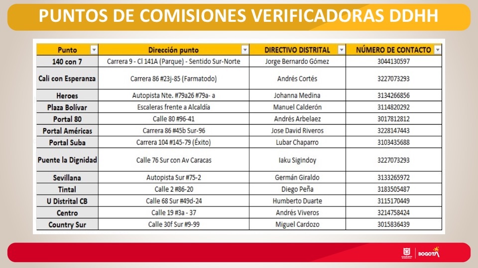 Por medio de la cuenta de Twitter de la Alcaldía de Bogotá se informó que "por motivos de orden público y de las dificultades en la movilidad que se presentan en Bogotá debido a las protestas" se cambiaron los puntos de toma de prueba gratuita para covid-19 y solo prestarán el servicio en los siguientes puntos: