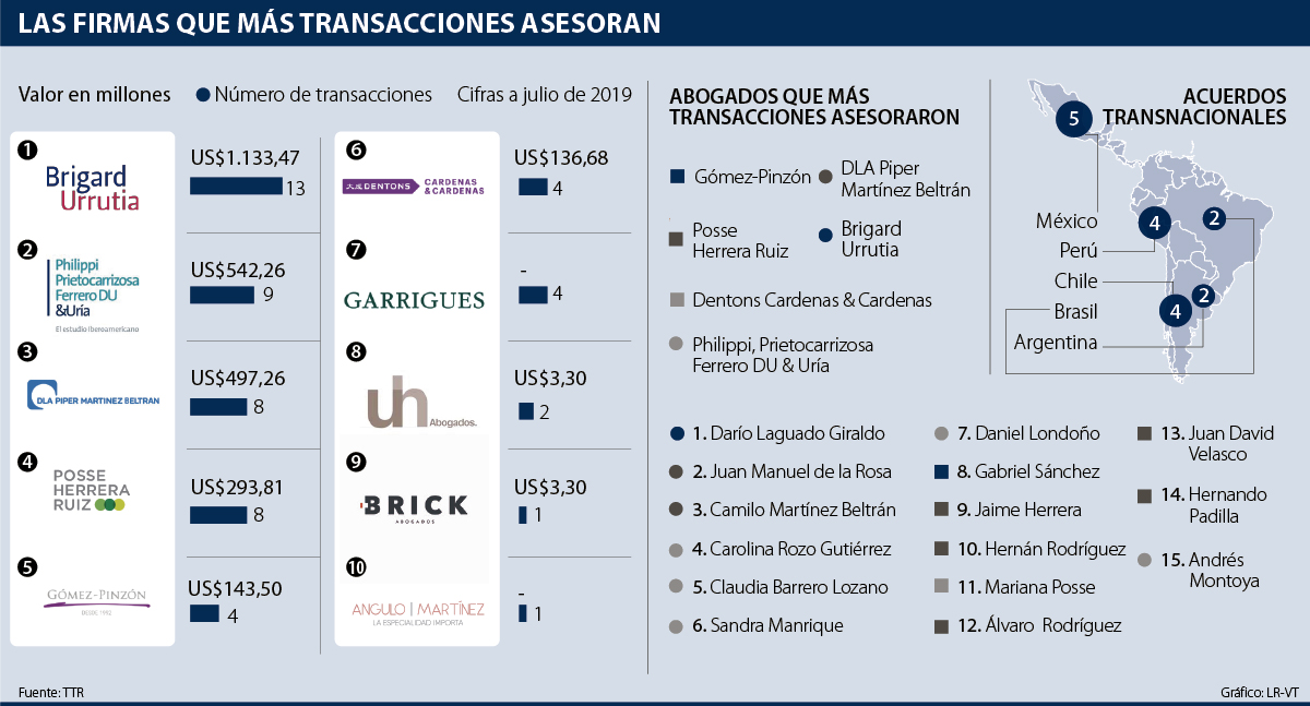 Según la información de TTR, el top de las firmas que más transacciones han asesorado lo lidera Brigard Urrutia, que con 13 acompañamientos, acumula negocios por US$1.133 millones. Más de la mitad de estas transacciones fueron supervisadas por su socio Darío Laguado.