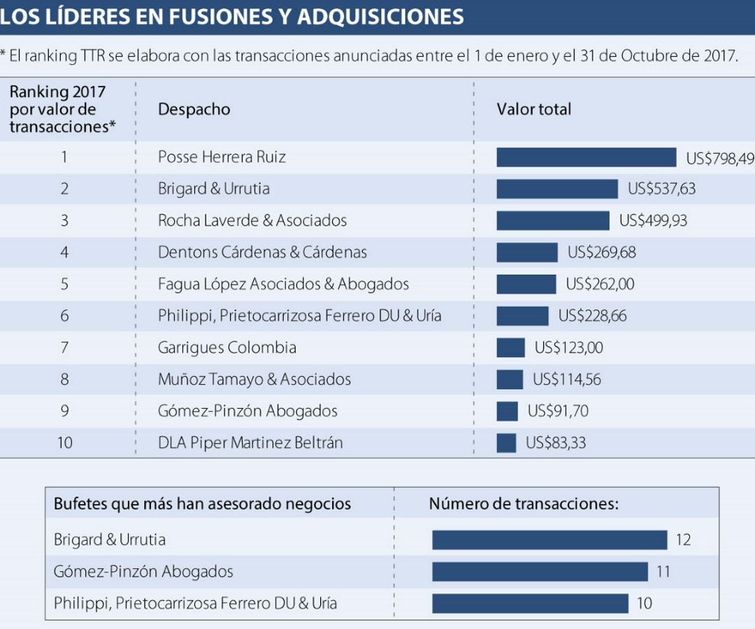En el informe, TTR señaló que entre el 1 de enero de este año y 31 de octubre de 2017, fueron Posse Herrera Ruiz, Brigard & Urrutia, Rocha Laverde & Asociados, Dentons Cárdenas & Cárdenas y Fagua López Asociados & Abogados los bufetes que se posicionaron en el top 5 de firmas con sumas más altas por asesoras transacciones.