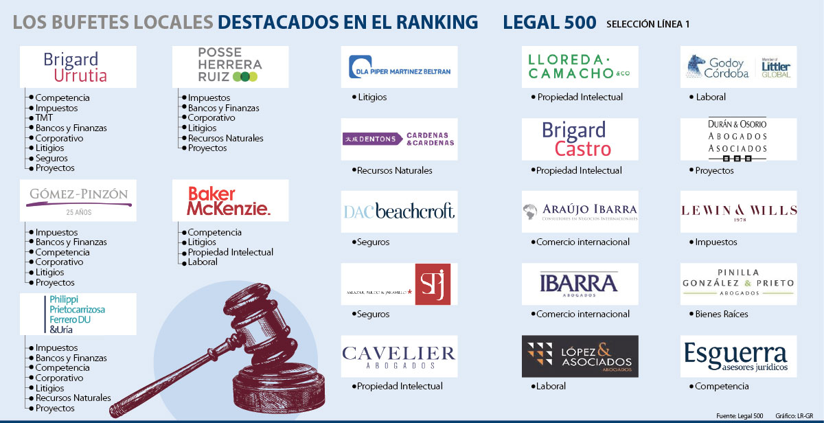 Legal 500, uno de los más reconocidos rankings dentro del mundo de las firmas de abogados, publicó sus resultados para 2018. Dentro del mercado interno, más de 20 firmas nacionales lograron posicionarse en la línea 1 de las 14 categorías estudiadas. Las firmas que recibieron mayores nominaciones fueron Brigrad Urrutia con ocho menciones; Philippi Prietocarrizosa Ferrero DU & Uría (PPU) con siete menciones; Gómez Pinzón Abogados y Posse Herrera Ruiz tuvieron seis menciones cada una y Baker MacKenzie logró cuatro menciones.