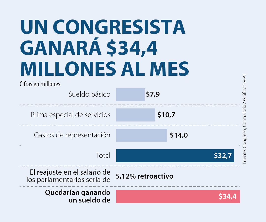 En la actual situación, si el salario de los congresistas se multiplicara por el total de ellos (280), al mes ese gasto sería de $9.637 millones; eso quiere decir que al año se van unos $115.644 millones.