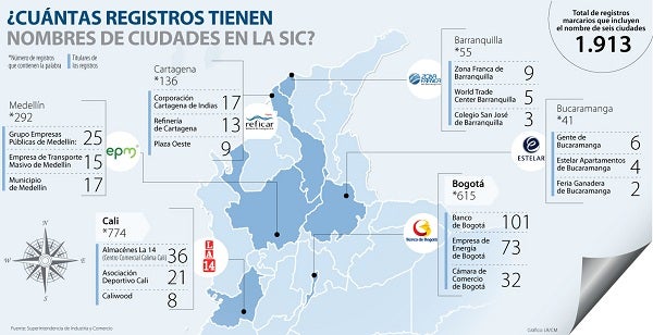 Ante la Superintendencia de Industria y Comercio (SIC) hay un total de 1.913 registros marcarios que involucran los nombres de seis ciudades principales de Colombia: Cali, Bogotá, Medellín, Cartagena, Barranquilla y Bucaramanga. Las dos primeras son las ‘reinas’ del ranking y se han vuelto bastante atractivas al momento de formar marca.