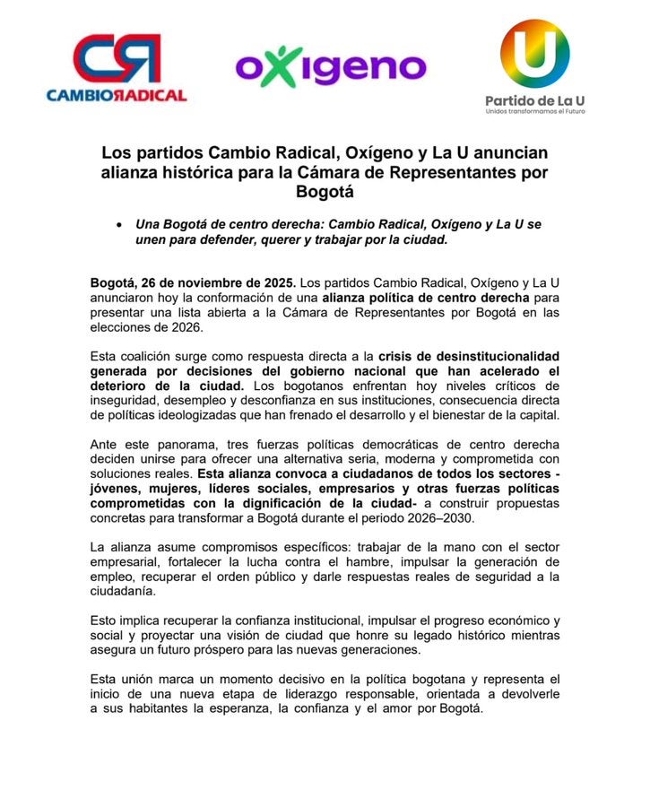“Esta coalición surge como respuesta directa a la crisis de desinstitucionalidad generada por decisiones del gobierno nacional que han acelerado el deterioro de la ciudad. Los bogotanos enfrentan hoy niveles críticos de inseguridad, desempleo y desconfianza en sus instituciones, consecuencia directa de políticas ideologizadas que han frenado el desarrollo y el bienestar de la capital”, aseguraron los partidos.