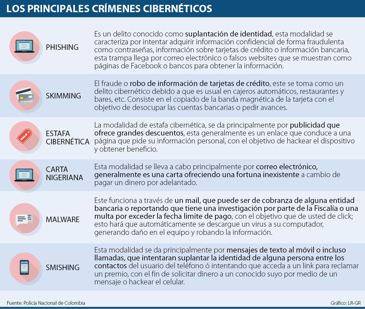Actualmente, existen seis delitos cibernéticos más comunes según la Policía Nacional, el primero es Phishing, que consiste en adquirir información confidencial de forma fraudulenta como contraseñas por medio del mails y páginas web y el Skimming que es cuando copian la banda magnética de las tarjetas de crédito.