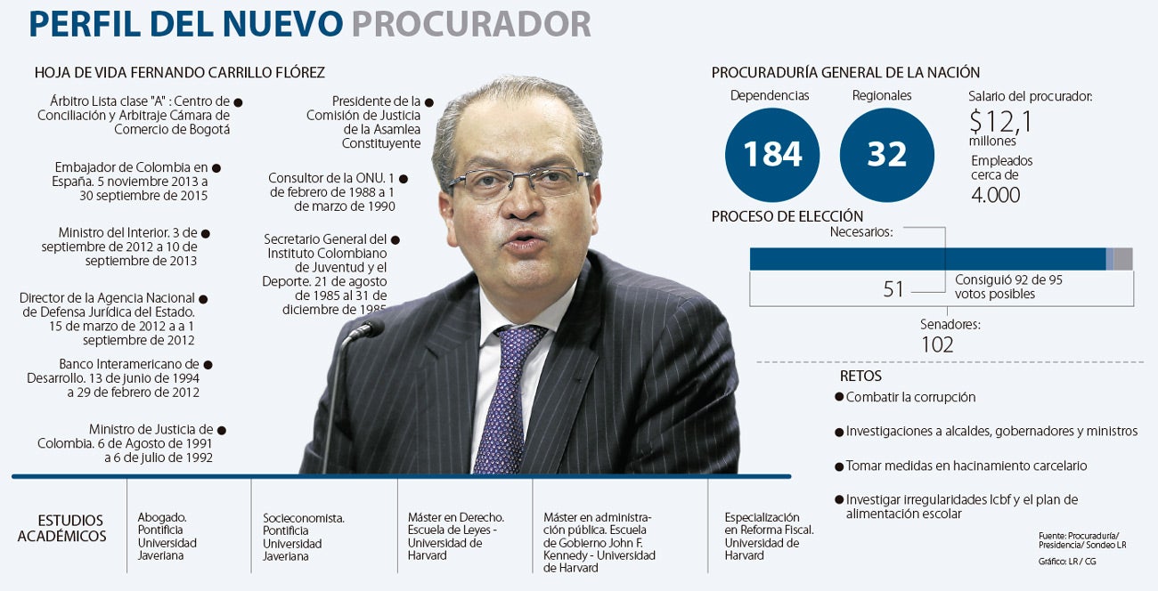 Carrillo, llegó a la Procuraduría luego de competir por el cargo con el ex vicefiscal Jorge Fernando Perdomo y María Mercedes López, en una votación definitiva ya que recibió el respaldo de 92 de 95 senadores habilitados para sufragar. Los votos necesarios para alcanzar el puesto eran 51. De esta manera Carrillo estará en el Ministerio Público que tiene cerca de 4.000 empleados, 184 dependencias y 32 regionales. También tendrá que cumplir con las tres funciones misionales: preventiva, para vigilar a los servidores públicos; intervención de entidades jurisdiccionales y la disciplinaria.