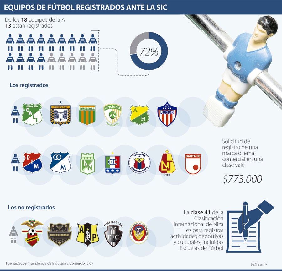 De los 18 equipos de fútbol profesional de la primera división, 13 han protegido el nombre de sus marcas y cinco todavía no lo han hecho ante la Superintendencia de Industria y Comercio, SIC.