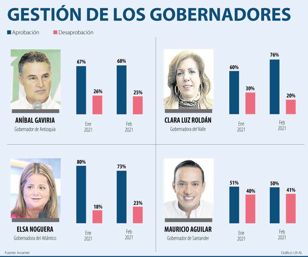 Por segunda vez en el año se mide la percepción de los ciudadanos frente a la gestión realizada por los gobernadores en los principales departamentos del país. En el más reciente informe de Invamer, realizado entre enero y febrero de 2021, el personaje con la más alta percepción es Clara Luz Roldán, gobernadora de Valle del Cauca.