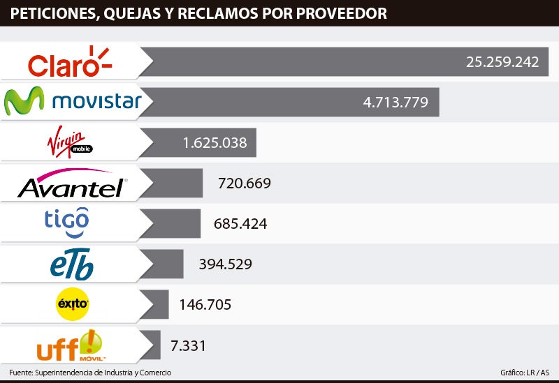 Claro se llevó 75,28% de dichas solicitudes (25,2 millones), seguido por Movistar (4,7 millones), Virgin Mobile (1,6 millones), Avantel (720.669), Tigo (685.424), ETB (394.529), Éxito (146.705) y Uff (7.331).