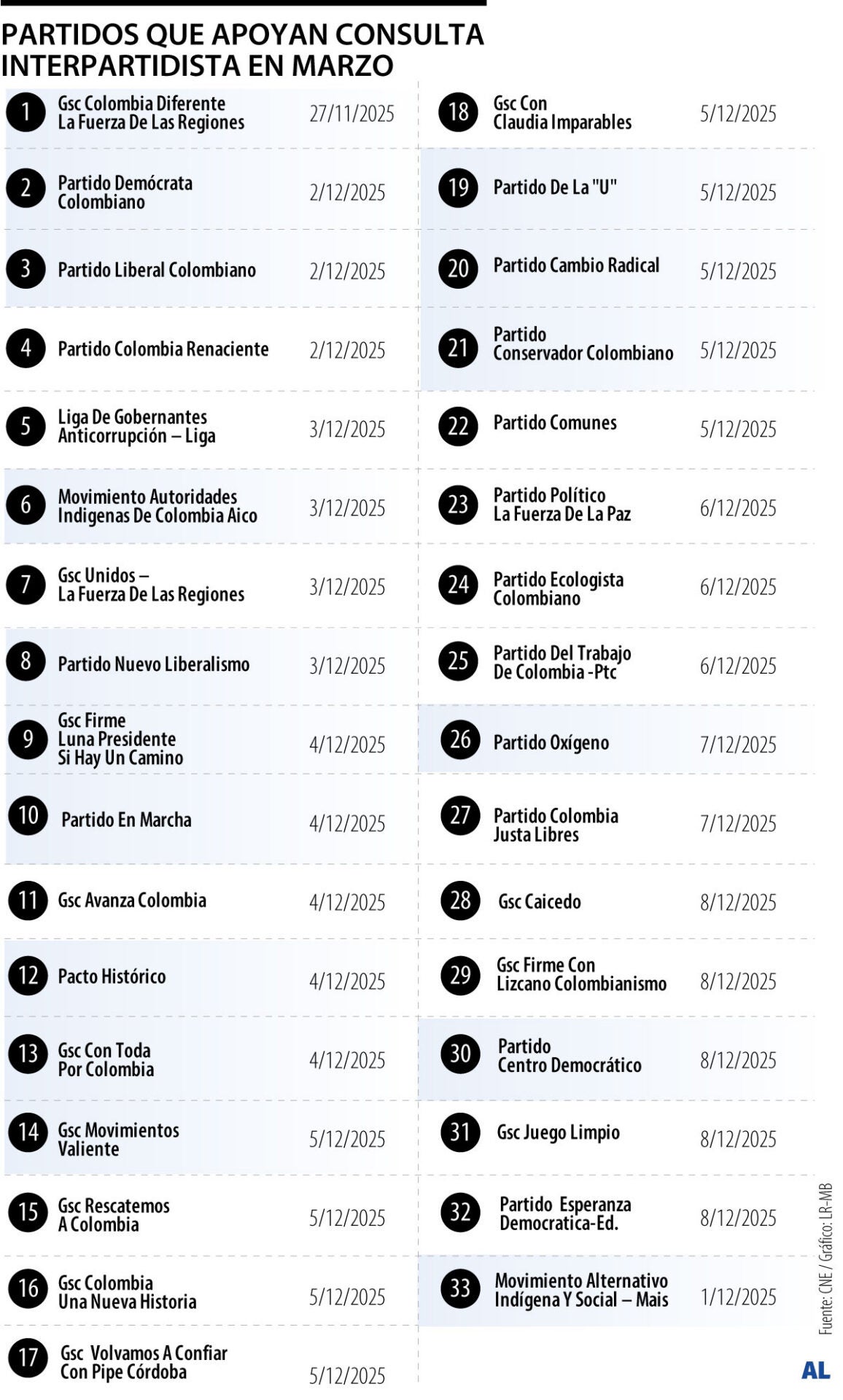 Por último, para completar los 33, en el festivo del puente de Velitas, GSC Caicedo. GSC Firme con Lizcano Colombianismo, Centro Democrático, GSC Juego Limpio, y Partido Esperanza Democrática también respaldaron la consulta del 8 de marzo de 2026.