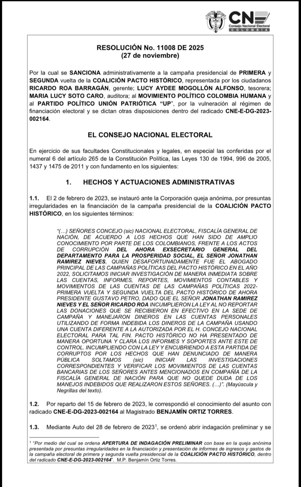 “El Consejo Nacional Electoral, a través de sus magistrados y conjueces, sancionó administrativamente a la campaña presidencial de primera y segunda vuelta de la coalición Pacto Histórico, por la vulneración al régimen de financiación electoral, que se concretan en superación de topes y fuentes indebidas de financiación”, dice el documento.