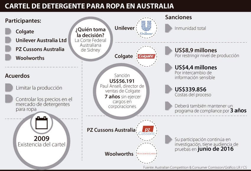 La Corte Federal Australiana de Sídney sancionó a Colgate con 18 millones de dólares australianos (US$13,8 millones) por varios conceptos. Restringir su nivel de producción, intercambio de información sensible, costos del proceso y además la empresa deberá mantener un estricto programa de compliance por al menos tres años.