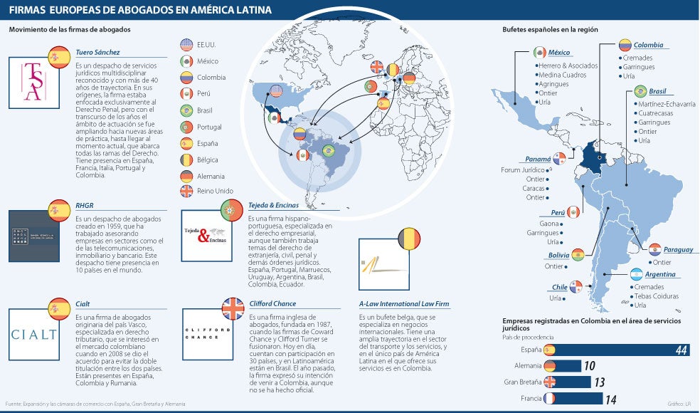 De acuerdo con la Embajada de España, “en los últimos años, varias firmas de abogados de esa nación se están estableciendo en Colombia en una apuesta clara por el dinamismo del mercado local”. Eso puede ser corroborado al ver cuántos bufetes de abogados están registrados en las cámaras de comercio entre Colombia y algunos países europeos.