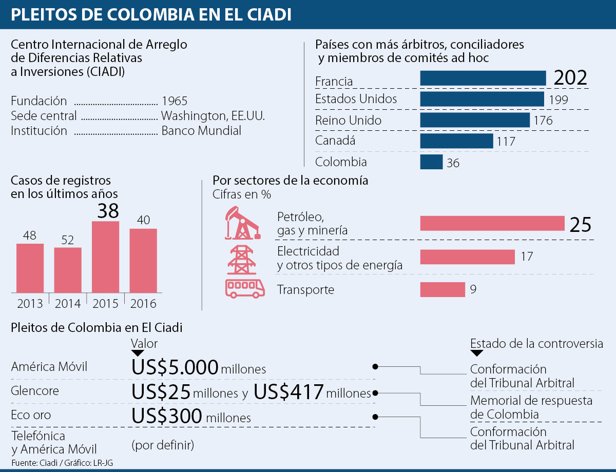 Cabe mencionar que además de los pleitos ante el Ciadi, el país tiene otras disputas internacionales, como por ejemplo, la relacionada con Electricaribe. De acuerdo con Guillermo Cáez, socio de Cáez, Gómez & Alcalde, este incremento de pleitos se debe “a las decisiones que han tomado autoridades judiciales y administrativas, que las compañías que han hecho gran inversión en Colombia han interpretado como violatorias de acuerdos o de los contratos suscritos”.