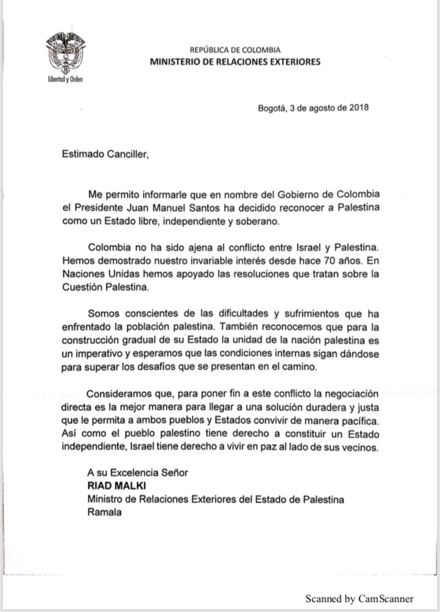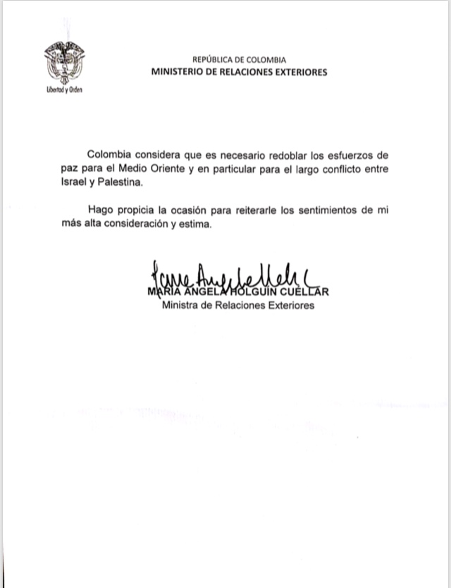 Por su parte, en la carta dirigida del ministerio de Relaciones Exteriores de Colombia a Riad Malki, ministro de Relaciones Exteriores de Palestina se dice que esta es la mejor manera para llegar a una solución duradera y justa. “Colombia no ha sido ajena al conflicto entre Israel y Palestina. Hemos demostrado nuestro invariable interés desde hace 70 años. En Naciones Unidas hemos apoyado las resoluciones que tratan sobre la cuestión palestina”, indica textualmente la carta.