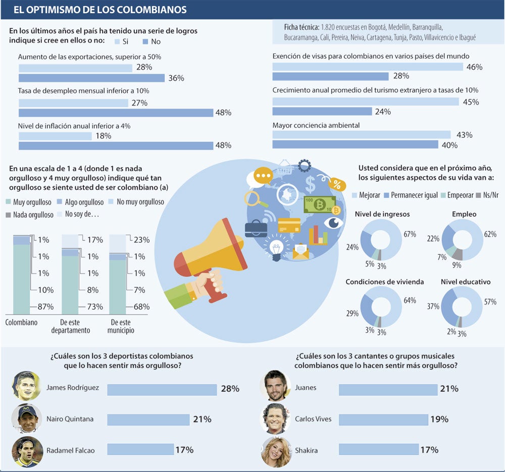 Los datos del estudio se recogidos entre el 9 y 16 de abril, también arrojaron que 87% de los entrevistados se siente orgulloso de ser colombiano, en lo que los deportistas y artistas jugaron un papel relevante.