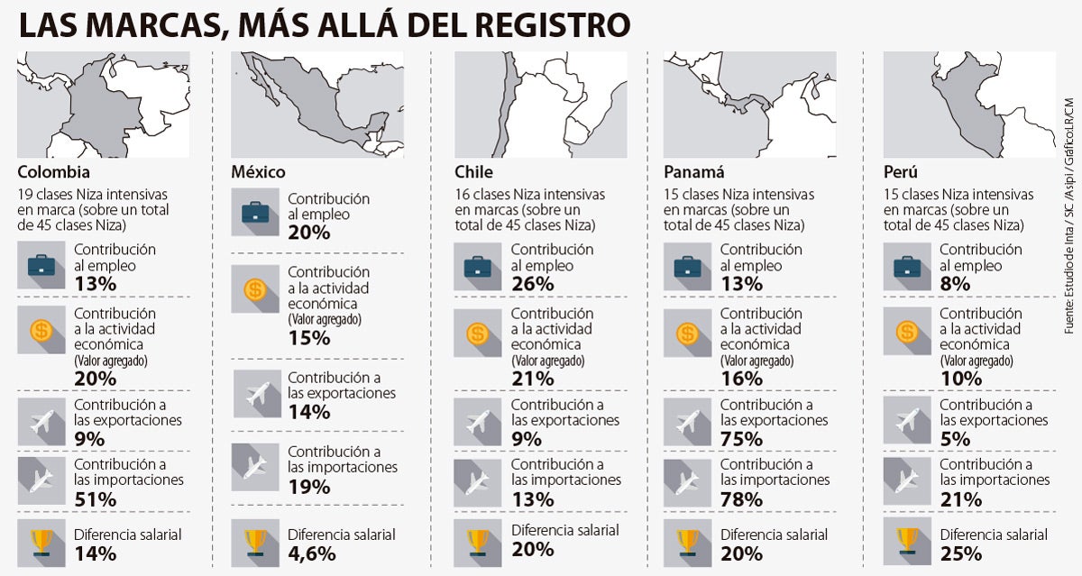 En el caso de Colombia se señaló que es la segunda en tamaño por población y PIB, luego de México. Según la Organización Mundial de la Propiedad Intelectual (Ompi), el país registró en 2015 un total de 41.929 marcas. En cuanto al impacto económico el estudio indicó que la contribución al empleo es de 13%, al PIB contribuye 20%, exportaciones 9%, importaciones 51% y retribución salarial en 14%.