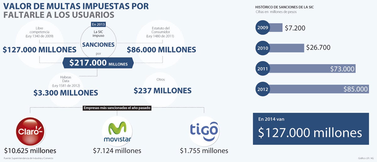 El año pasado los ‘pesos pesados’ de la telefonía celular: Claro, Movistar y Tigo, se convirtieron en los reyes de las multas y entre los tres sumaron 288 sanciones que equivalían a $19.505 millones de los $36.163 que acumuló el sector de comunicaciones. En 2014 la ‘cosa’ no ha variado mucho y como si no hubieran sentido dolor en los ‘bolsillos’ el año pasado, en los primeros cuatros meses del presente año ya adeudan entre los tres $7.608 millones. Los cobros extras y los silencios administrativos, están entre los casos más reiterativos en las compañías mencionadas, de acuerdo con Jorge Enrique Sánchez, delegado para la protección al consumidor de la SIC, quien también aseguró que ‘el trío’, está en la obligación de generar un código de cinco dígitos en el que sus clientes puedan enviar un mensaje de texto con la palabra ‘acepto’, en caso de que deseen continuar recibiendo chistes, poemas, rocolas y otros servicios que tengan vigentes y por los que se generan cobros adicionales en las facturas.