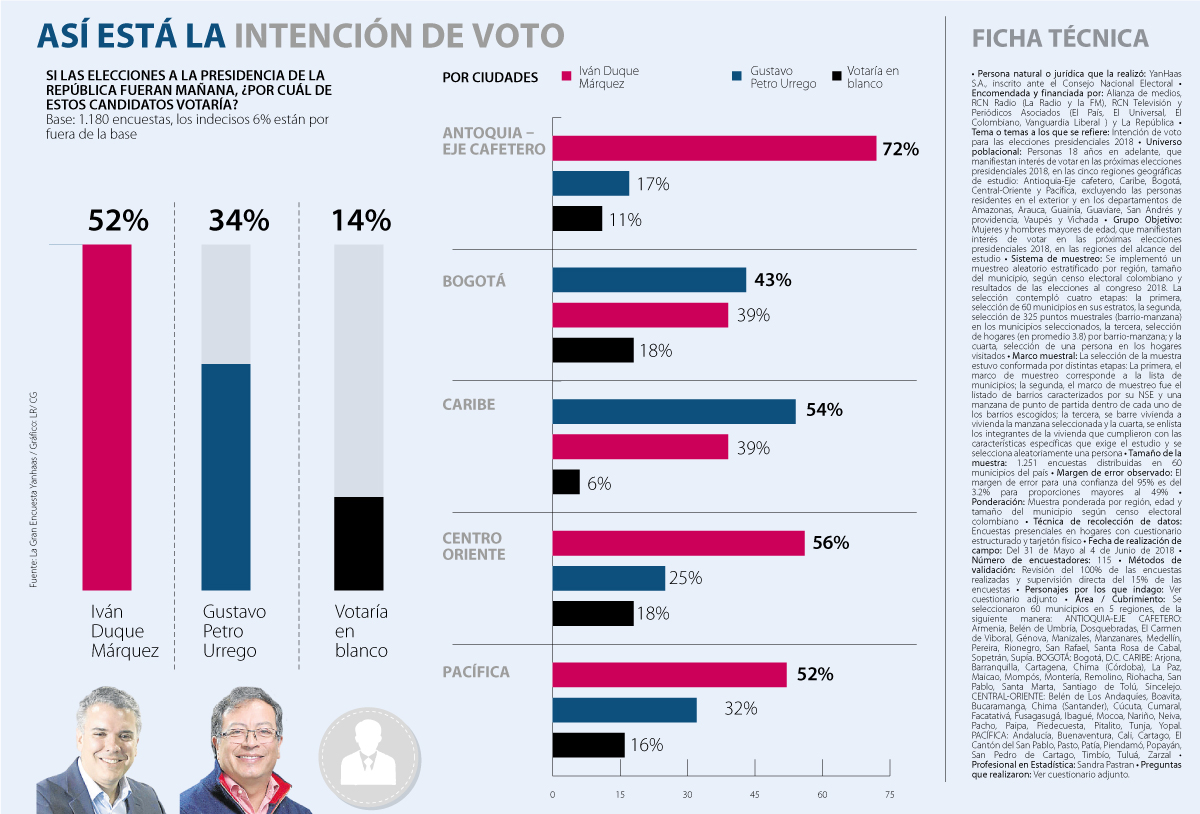 En estas dos plazas (Centro Oriente y Pacífico), el aspirante Gustavo Petro tan solo llega a 32% de favorabilidad, muy por encima del voto en blanco que, en las dos regiones, no supera la barrera de 20% en preferencia de voto.
