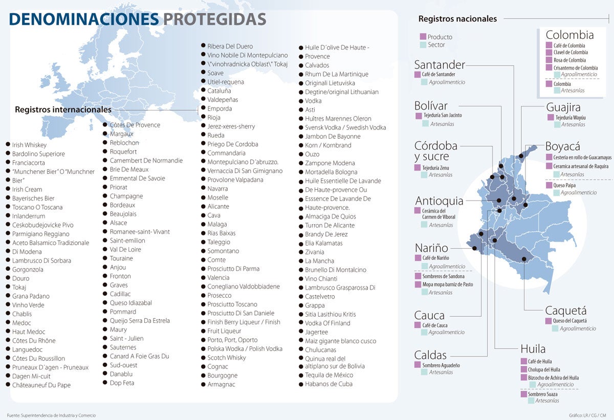 Bordeaux, Cataluña, Cognac, Mortadela Bologna, La Mancha, Vodka of Finland, Almaciga de Quios, Turron de Alicante, Brandy de Jerez, Bizcocho de Achira del Huila, Crisantemo de Colombia, Café de Nariño, Queso Paipa, Sombrero Suaza, Tejeduria Wayuu y Rosa de Colombia, son algunos de los registros existentes (ver gráfico).