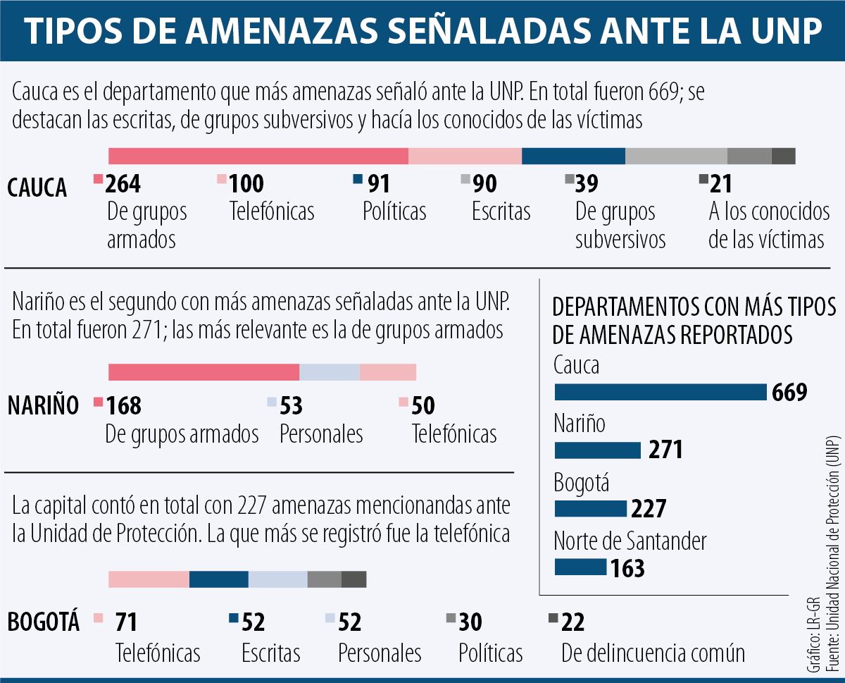 Según el informe de amenazas señaladas por los solicitantes de la UNP, los departamentos de los que más llegan solicitudes son Cauca. Los departamentos que reportan más amenazas son Cauca, Norte de Santander, Bogotá, Putumayo y Antioquia. Las amenazas más recurrentes son las que provienen de cuatro actores principales: los grupos armados, los grupos subversivos, la delincuencia común y la delincuencia organizada.