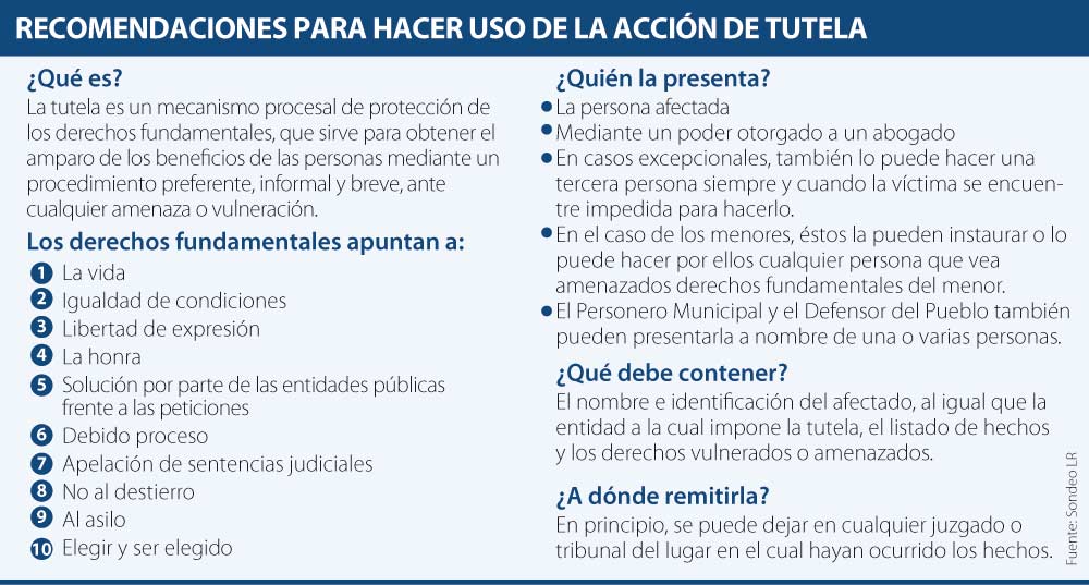 Lo relevante de emplear la tutela radica en que es eficaz y fácil de usar para los ciudadanos, ya que 'la puede instaurar la persona afectada o mediante poder otorgado a un abogado. En casos excepcionales, también lo puede hacer una tercera persona siempre y cuando la víctima se encuentre impedida para hacerlo. En el caso de los menores, éstos la pueden instaurar o lo puede hacer por ellos cualquier persona que vea amenazados derechos fundamentales del referido menor. El personero municipal y el defensor del pueblo también pueden presentarla a nombre de una o varias personas', asegura el abogado Ignacio Cantillo.