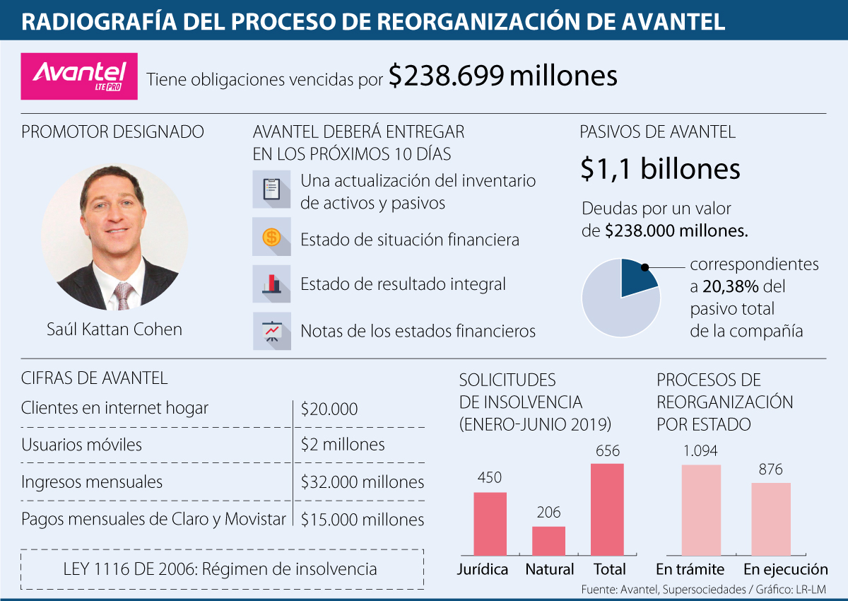 La deuda vencida de Avantel asciende a $238.000 millones y el total del pasivo alcanza $1 billón. Dentro del proceso fue designado como promotor Saúl Kattan Cohen. Sin embargo, este tiene una sanción de la Superfinanciera, de la cual la Supersociedades, expresó que “no es impedimento para ejercer esta función”.