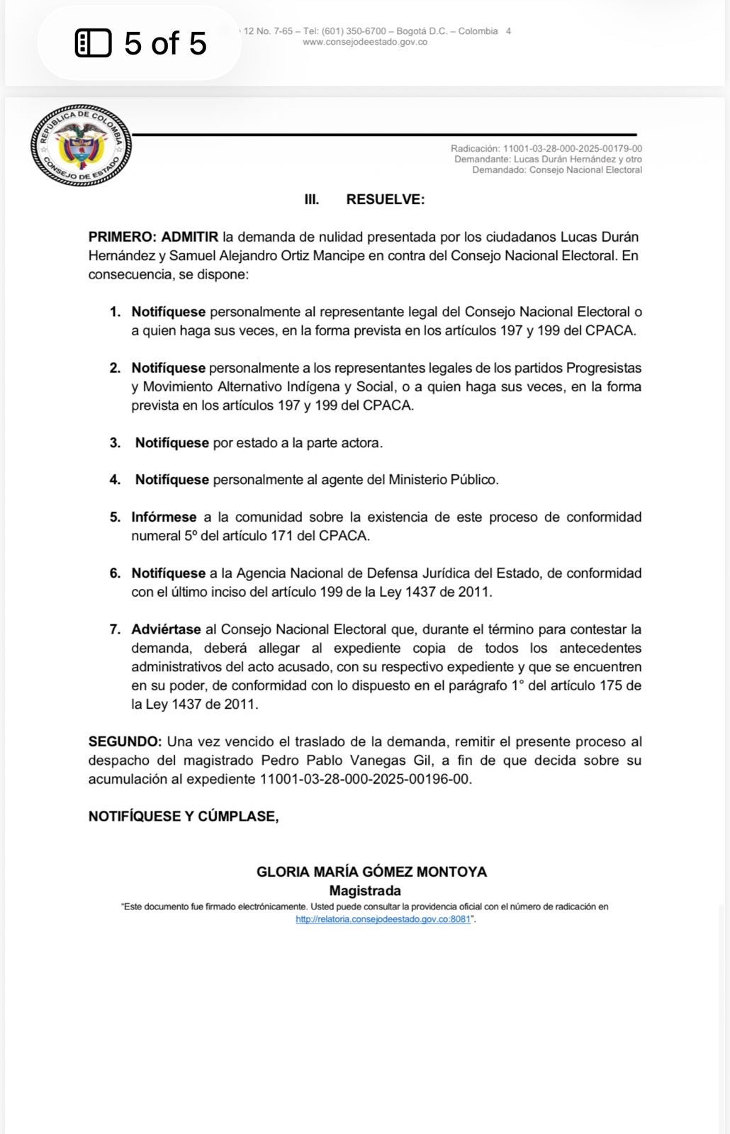 “Se admite la demanda de nulidad presentada por los ciudadanos Lucas Durán Hernández y Samuel Alejandro Ortiz Mancipe en contra del Consejo Nacional Electoral”, se aseguró en la carta.