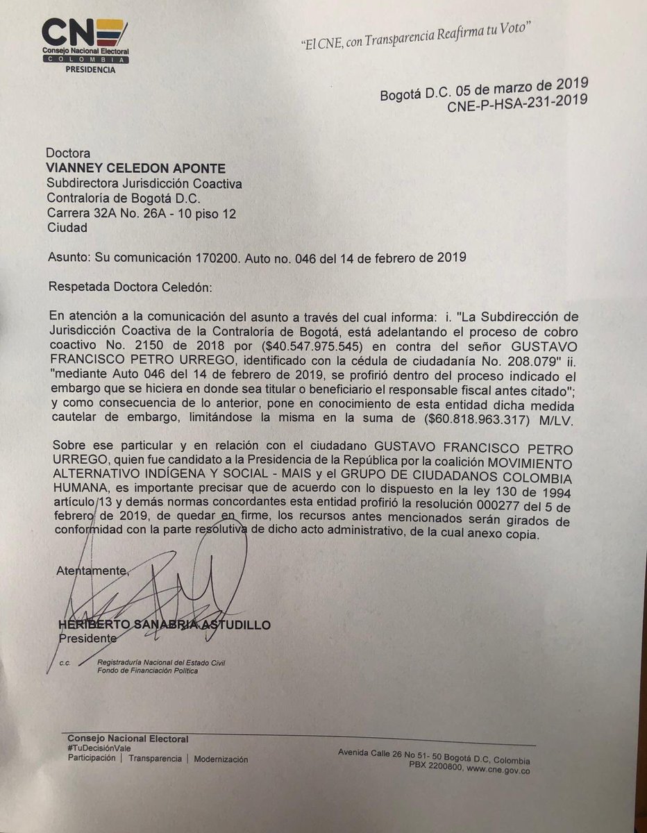 Mediante una resolución, el Consejo Nacional Electoral informó que realizará la devolución de los dineros al movimiento político Colombia Humana. La entidad se ajustó a las disposiciones legales y afirmó que el acto administrativo que promueve la sustitución de votos es completamente válido.