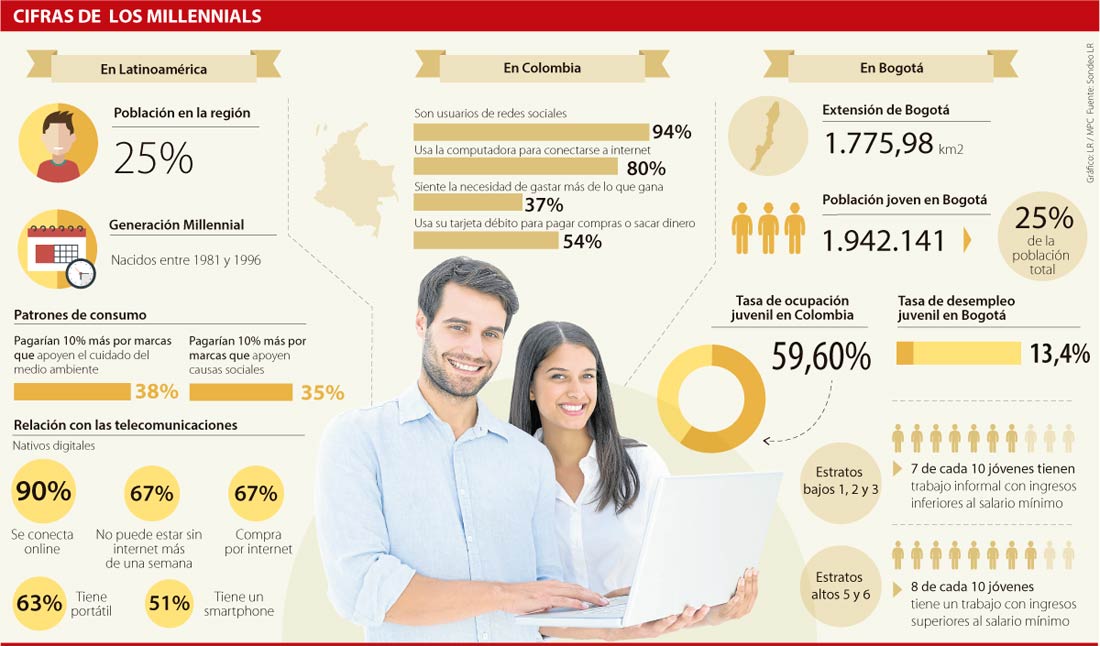 Bogotá cuenta con una participación porcentual de 25% dentro del PIB. La población total de habitantes es de 7.467.804, de los cuales 1.942.141 (25%) figuran como población juvenil (millennial); que al mismo tiempo está dividida dentro del sistema de estratificación social.